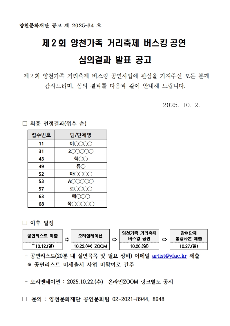 2025년 제2회 양천가족 거리축제 버스킹 공연 심의결과 발표 공고