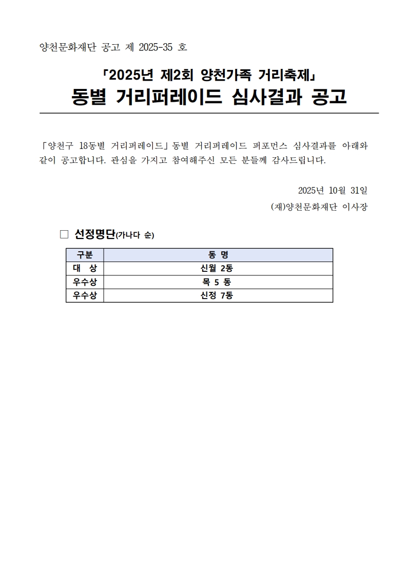 2025년 제2회 양천가족 거리축제 동별 거리퍼레이드 심사결과 공고