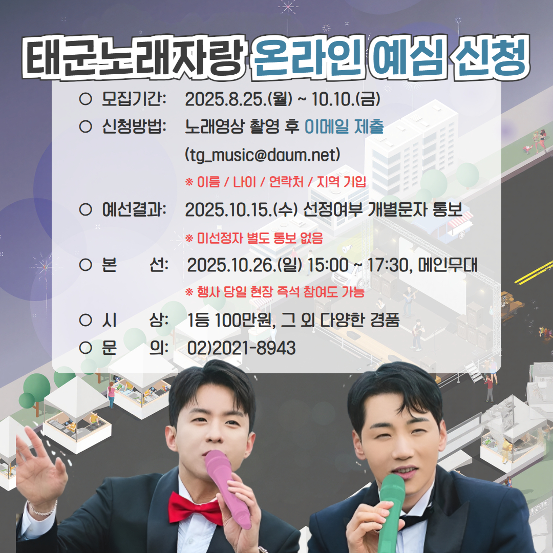♣태군노래자랑 참가자를 모집합니다! [온라인 예심 신청] ◎ 모집기간: 2025.8.25.(월)~10.10.(금)까지 ◎ 신청방법: 노래영상 촬영 후 이메일 제출(tg_music@daum.net) ※ 이름 / 나이 / 연락처 / 지역 기입 ◎ 예선결과: 2025.10.15(수) 선정여부 개별문자 통보 *미선정자 별도 통보 없음 [본선] ◎ 일시: 2025.10.26.(일) 15:00~17:30 ◎ 장소: 양천가족거리축제(메인무대) ※ 행사 당일 현장 즉석 참여도 가능 ◎ 출연진: 박군, 나태주 ◎ 시상: 1등 100만원, 그 외 다양한 경품 ☎ 문의: 양천문화재단(02-2021-8943) ![]()