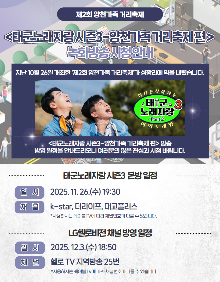 | 2025년 제2회 양천가족 거리축제 <태군노래자랑 시즌3-양천가족 거리축제 편> 녹화방송 시청 안내 |